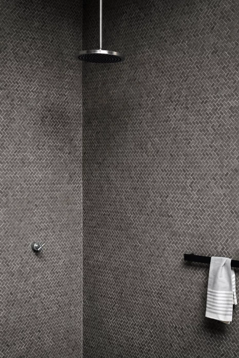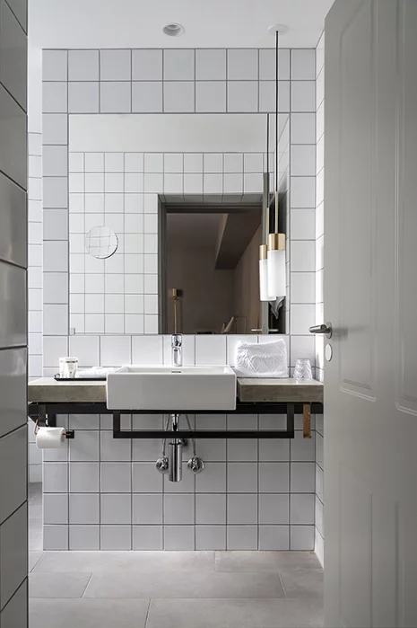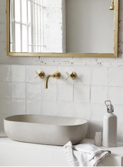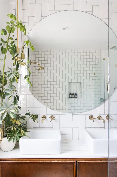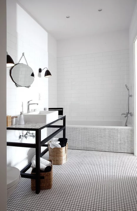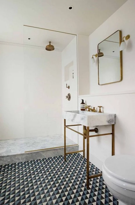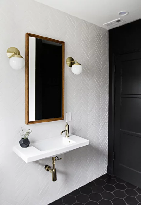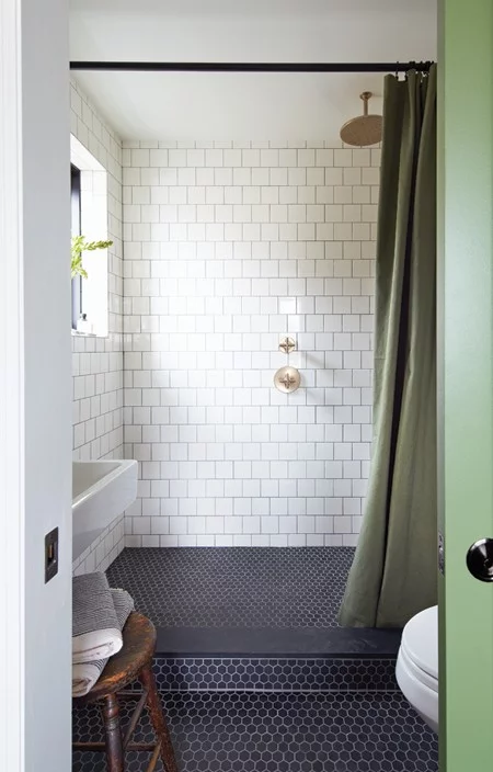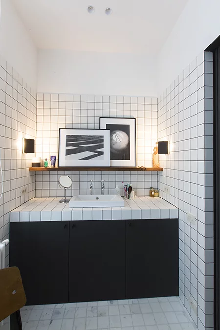 En contraste avec les matériaux rétro, comme le marbre et le laiton, voyez comment la propriétaire a choisi des éléments modernes tels que les fenêtres peintes en noir et les œuvres d’art, afin de réaliser une salle de bain charmante, à petit budget.